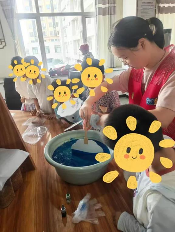为了让孩子们直观感受到漆扇传统工艺的魅力,志愿者就地取材,紧握着孩子们的小手共同去完成扇面的染色制作,大手牵小手,温暖满心头。志愿者向孩子们讲述漆扇的历史,让他们在制作中感受深厚的文化底蕴。当一把把精美的漆扇在孩子们手中完成时,他们的脸上洋溢的自豪和喜悦,既是对文化的传承,也是对自我能力的肯定。