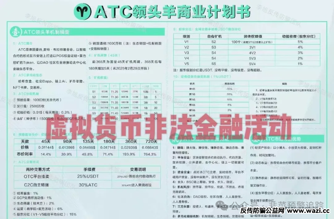 ATC领头羊是虚拟币交易项目,用智能合约、算力挖矿作噱头,看似高大上,实则无实际落地场景。它宣称每天涨 0.3%,却无实际盈利支撑,价格全由人为操控,下跌风险巨大。承诺稳赚不赔的虚拟资产根本不可信,大家千万别上当!