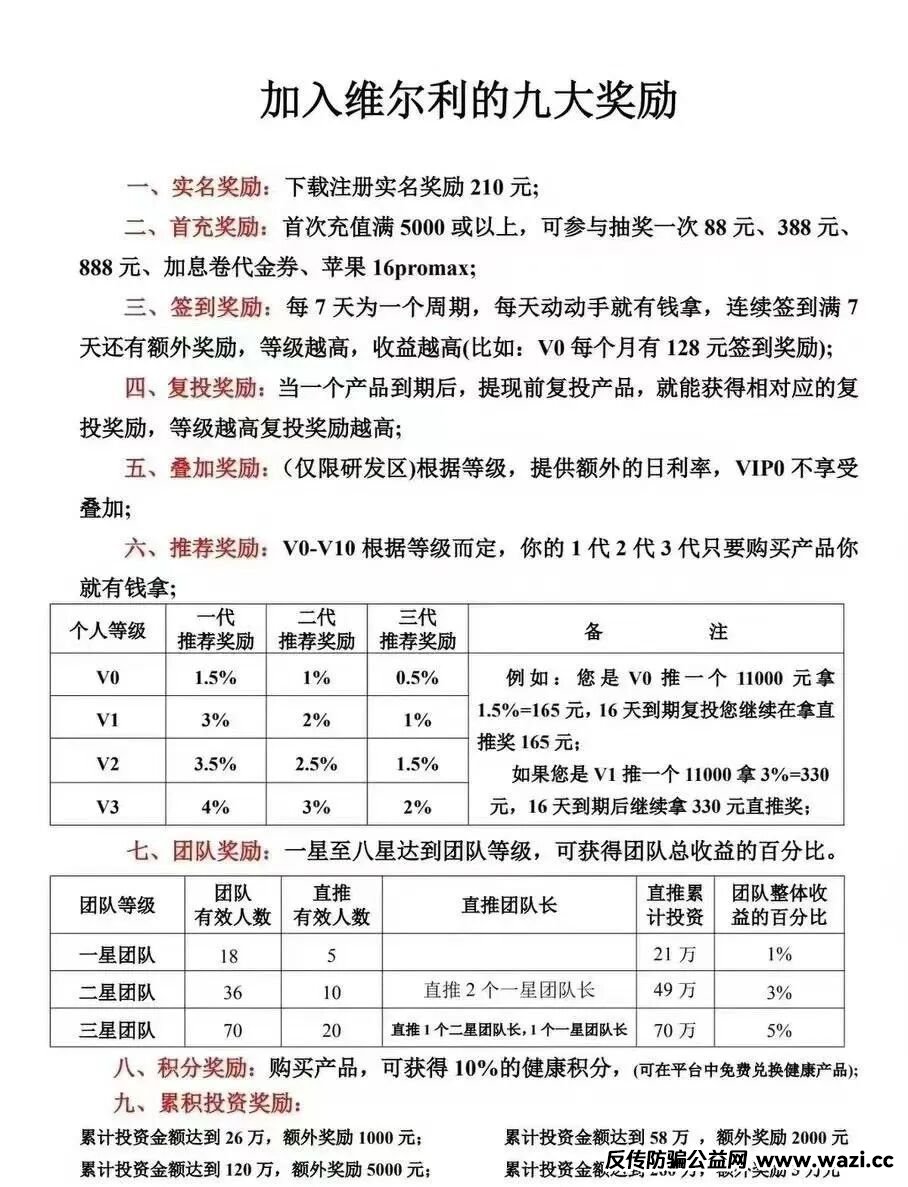 该“维尔利”的项目介绍和模式制度,在市场上很多团队长,对外宣称投资致富为口号,在高收益的前提条件下,通过短时间吸引投资者,主要是打着健康产业的幌子,虚构前沿科技,并承诺投资者在短期内获得数倍的回报,良心弟仔细深入研究和查询相关资料,这些项目大多数都是套用正规的公司作为市场的背书,目前已经有不少团队被单割。