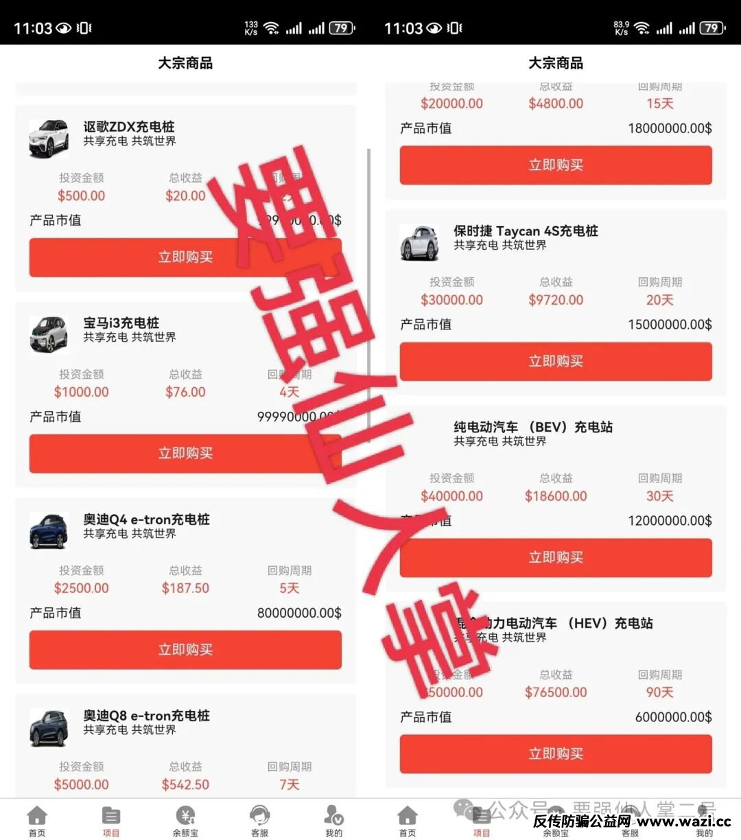 再看看它的平台产品,所谓的“现代充电桩、宝马充电桩、奥迪充电桩”全是假的,不过是骗子P图或编造的概念。更离谱的是它的收益:日化率1%-3.4%,换算成年化率就是365%-1241%!稍微有点常识的人都知道,充电桩行业根本不可能有这么高的收益,这分明是把“陷阱”包装成了“馅饼”。