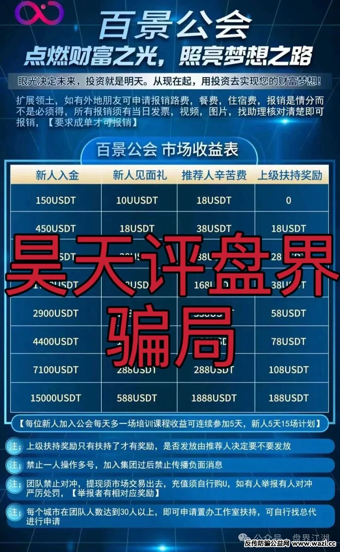 昊天评盘界:今天昊天带大家曝光一下一个叫百景公会的合约跟单类资金盘骗局,最新消息:之前“康卡斯特”诈骗团伙崩盘后开的盘,也4个月了,目前部分团队已经撤离,已经开始单割,高度预警,即将崩盘跑路!
