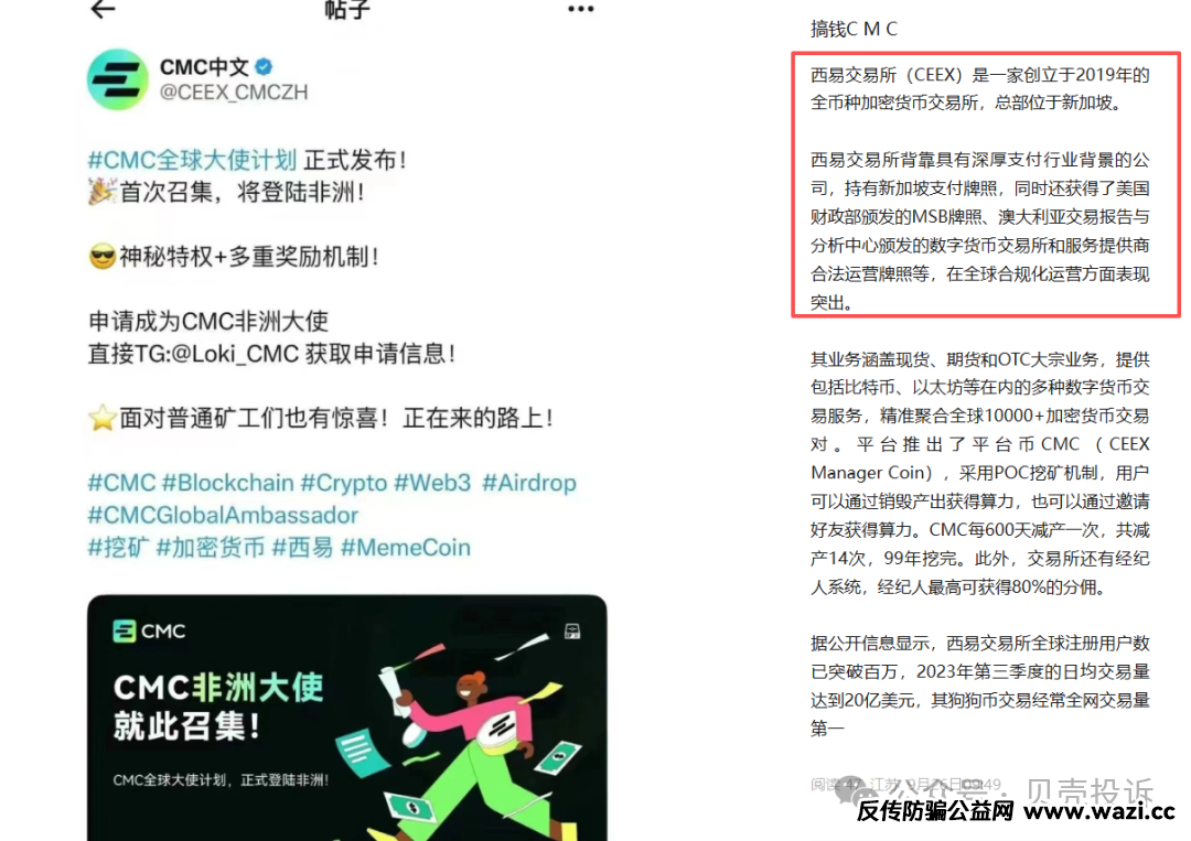 近期不断有粉丝询问这个CEEX平台,还有他的代币CMC,今天我们就再次来说一说吧。这个看似华丽的交易平台,实则为一场即将崩塌的资金盘游戏,无数散户投资者正面临血本无归的风险。 “0撸挖...
