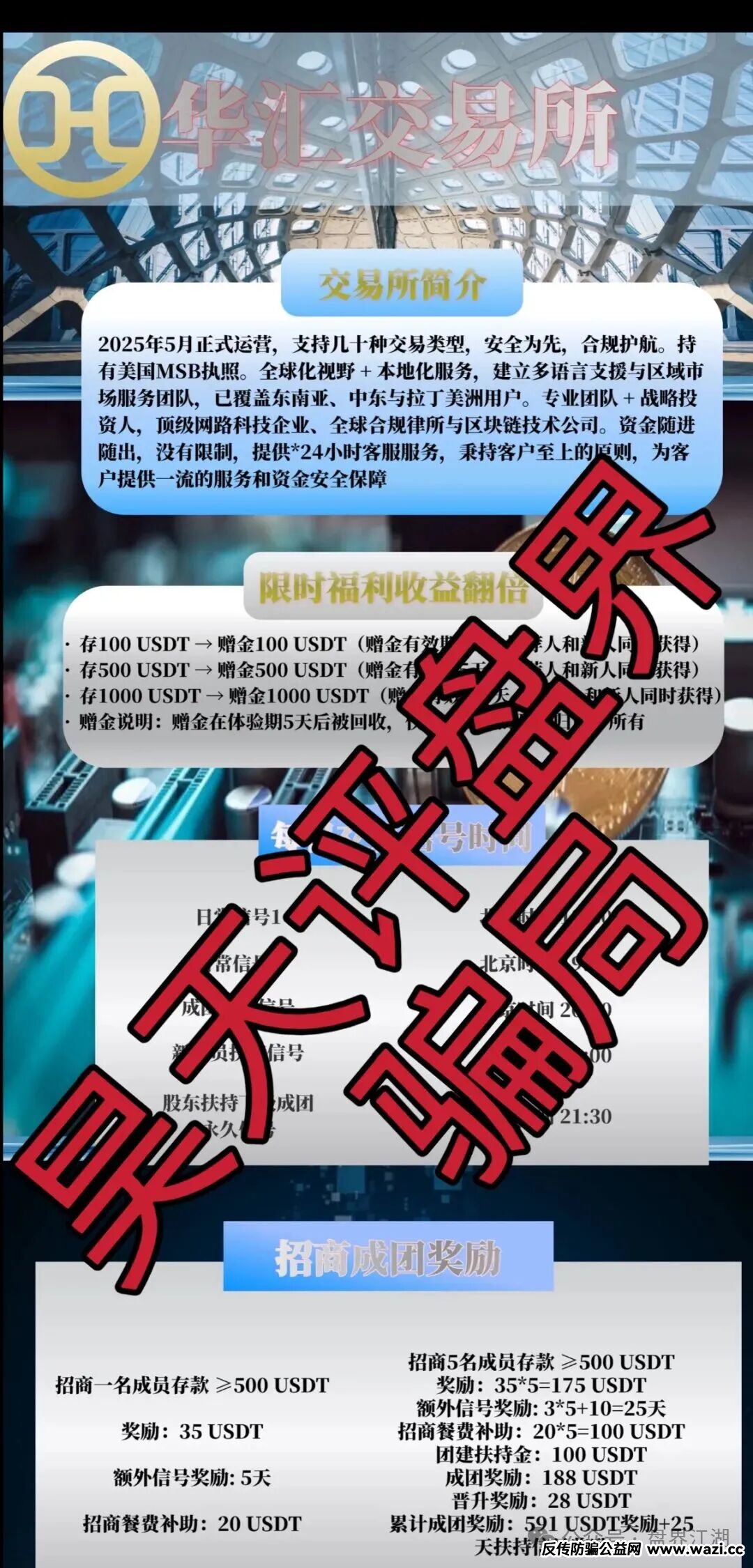 此骗局就是柬埔寨诈骗团伙搞的盘,包装此盘是2025年5月正式运营,支持几十种交易类型,安全为先,合规护航。持有美国MSB执照。全球化视野+本地化服务,建立多语言支援与区域市场服务团队,已覆盖东南亚、中东与拉丁美洲用户。专业团队+战略投资人,顶级网路科技企业、全球合规律所与区块链技术公司。模式九级军衔制暴露了其传销诈骗本质。从“火长”到“元帅”,华汇交易所构建了一套极具煽动性的等级体系。晋升不看业绩,只看拉人数量。直推五人升火长,团队满1万人为“元帅”。每一个头衔背后,都是赤裸裸的传销拉人套路,直推奖励、团队佣金、等级津贴三管齐下。老会员的“工资”由新会员支付,形成典型的金字塔式资金流动。一旦新增资金放缓,整个体系立即崩盘。