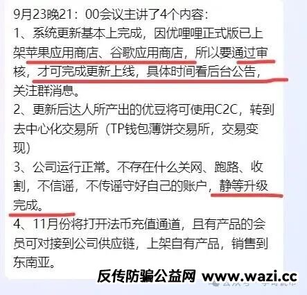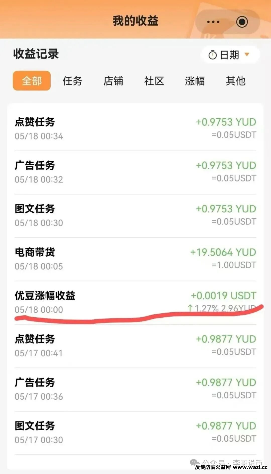 这种套路就是屡试不爽,之前很多盘子也是这样,先是升级三天,然后升级五天,现在说对接苹果商店,不知道具体哪天才能上线。有些盘子升级升着升着就没了,维稳团队会骗你,导师团队长也会骗你。但是你自己去看优哩哩项目方的钱包,里面的U流转记录不会骗人,你会眼睁睁的看着你的钱从你的眼皮子底下溜走。