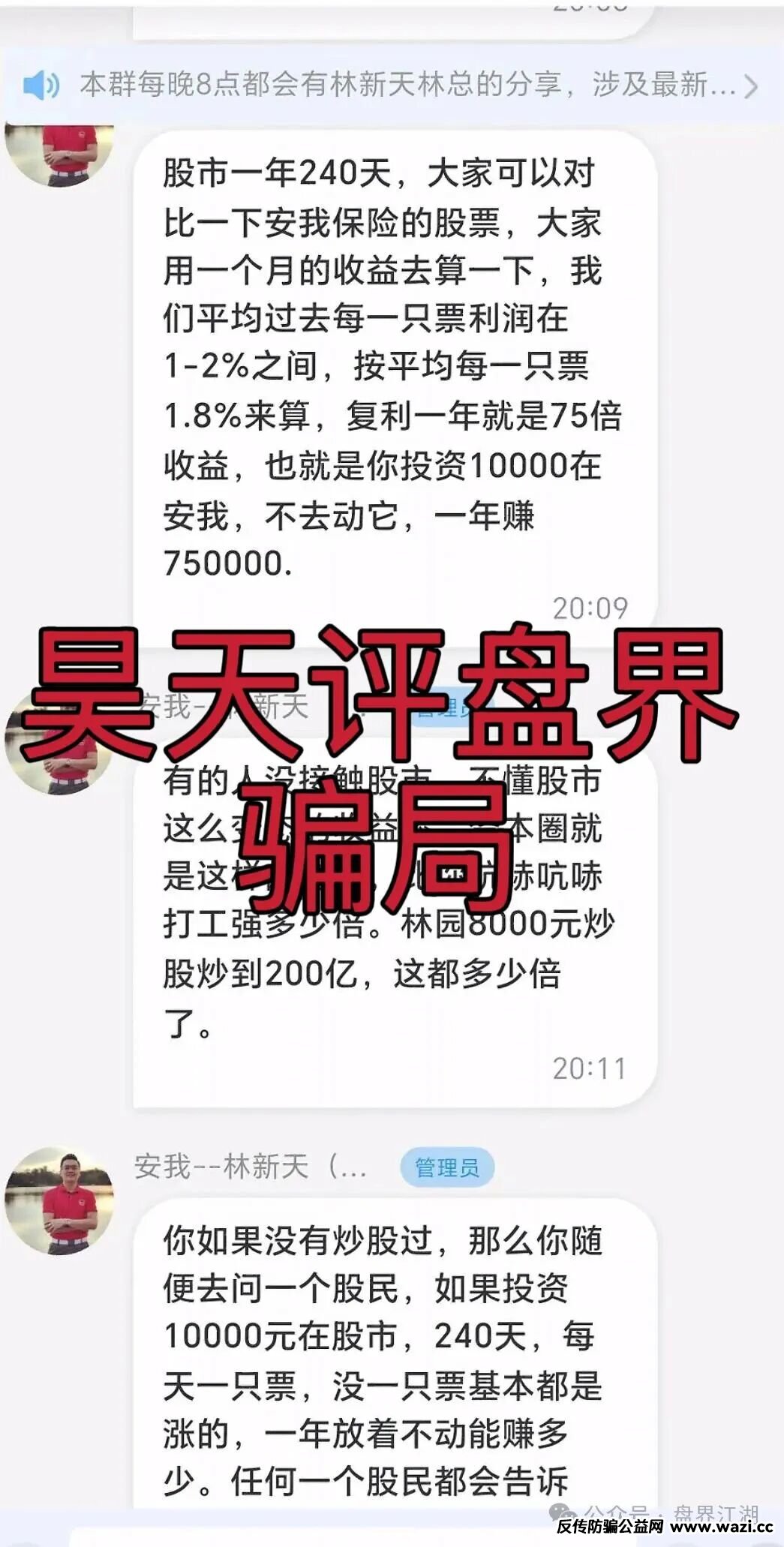 昊天评盘界友情提醒:安我股保:亏了全额包赔?其实就是股票跟单类资金盘骗局,正规公司已经出面打假,操盘手林新天圈钱过亿,高度预警,即将崩盘跑路!近期知乎,小红书,微博,抖音等app都有冒充昊天的诈骗团伙,除公众号外其他一律不是本人,我们不推广任何项目,大家切勿上当受骗!