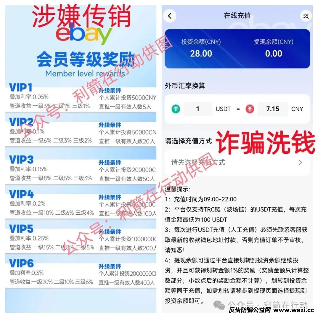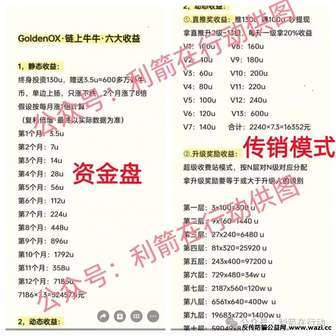 该项目有严格的等级制度,组建团队,层级计酬,与诈骗洗钱的虚拟币项目的模式几乎是一样的,随着金额的加大投资,周期越拉越长,“收益”越来越高的特点看出该项目是杀猪盘,收款账户是个人账户与充值虚拟币进行“投资”,这也是诈骗洗钱的传销项目。