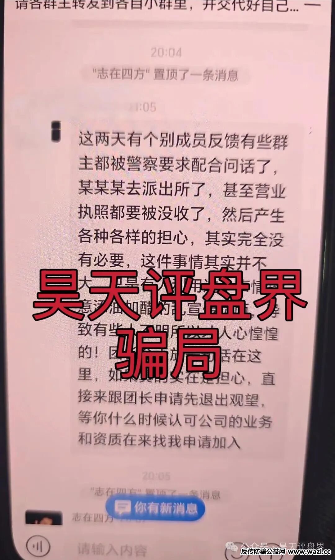 据知情人提供给昊天的资料显示不少所谓的工作室已经被调查,对此诈骗团伙还在群里发了个公告如下:这两天有个别成员反馈有些群主都被警察要求配合问话了,某某某去派出所了,甚至营业执照都要被没收了,然后产生各种各样的担心,其实完全没有必要,这件事情其实并不大,只是有人利用这个事情故意添油加醋的乱宣传负面,导致有些人不明所以才人心惶惶的!团长今天放一句话在这里,如果真的实在是担心,直接来跟团长申请先退出观望等你什么时候认可公司的业务和资质在来找我申请加入,其实这就是诈骗团伙和团队长为了维稳继续忽悠下面会员的借口,这是很明显的跑路前兆: