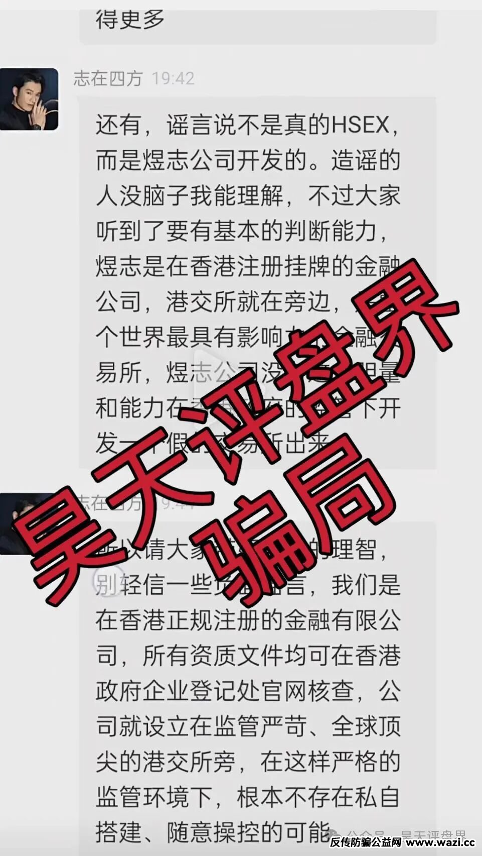 昊天评盘界:HSEX煜志金融交易所骗局,昊天之前也是预警过几次了,相信粉丝都已经安全撤离了,这个骗局基本上每个月都会单割一部分会员,很多人不知道之前这个资金盘骗局是叫HKEX,也是去年...