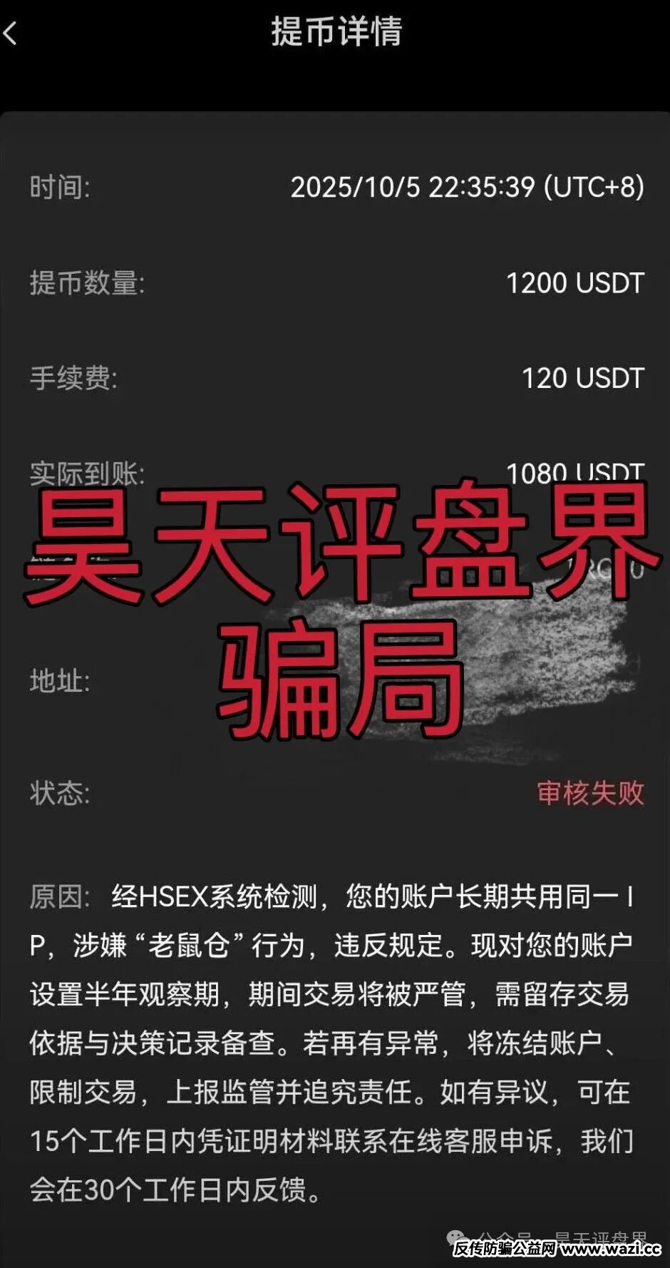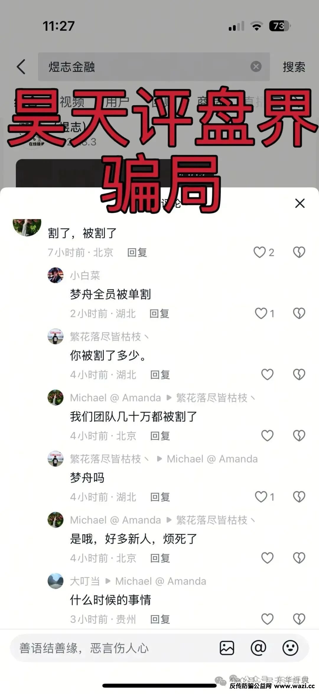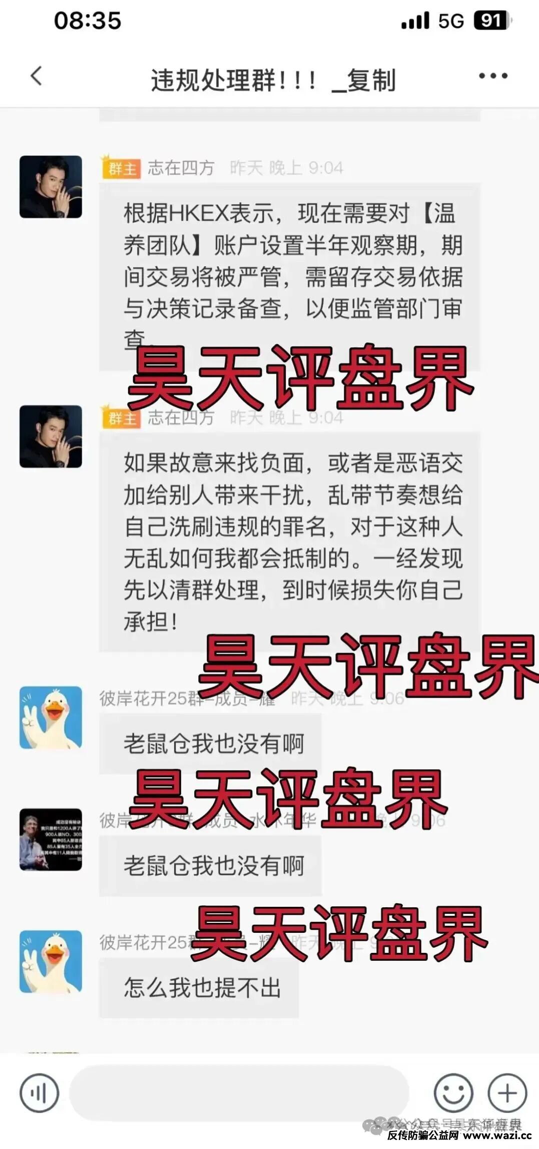 昊天评盘界友情提醒:HSEX煜志金融交易所骗局,操盘手李煜志圈钱几十亿,13万会员,大量单割会员,已经被调查中,下个月绝对要跑路了,速度撤离,不然就要接盘了,近期知乎,小红书,微博,抖音等app都有冒充昊天的诈骗团伙,记住了我们不做项目,更不会去推广任何项目,除公众号外其他一律不是本人,切勿上当受骗!