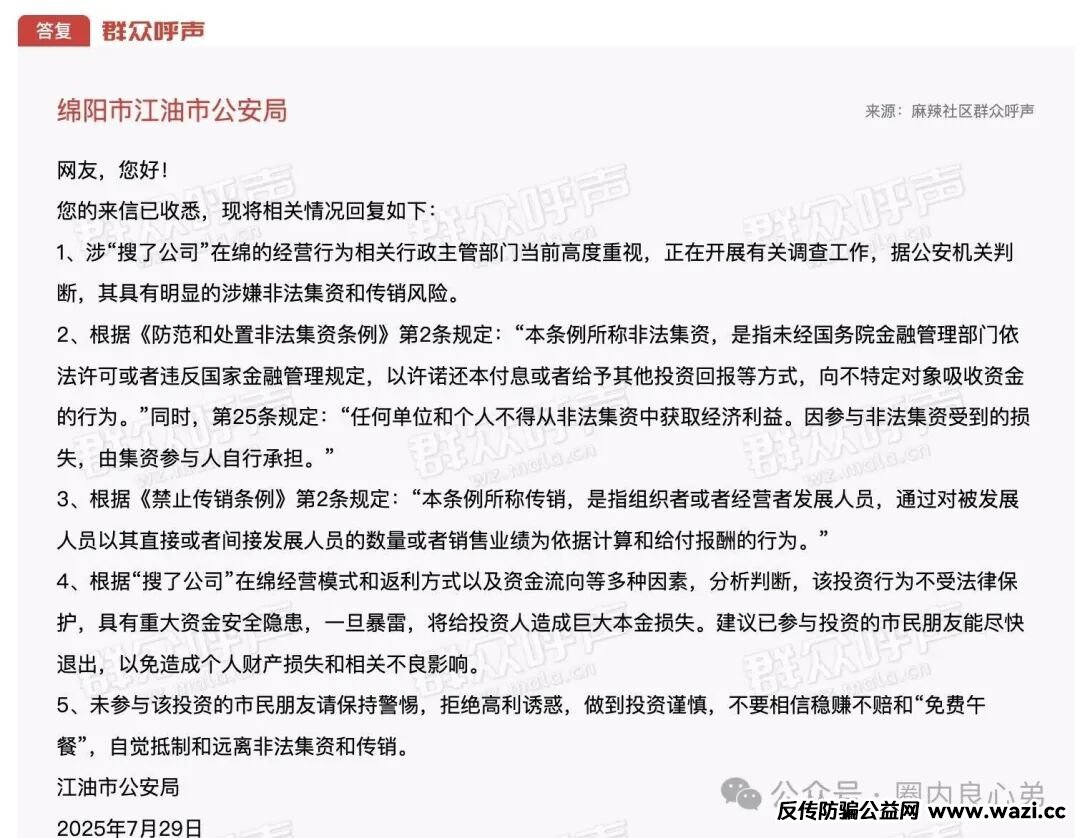 绵阳市群众举报搜了集团涉嫌传销。这项目已经被多次举报过了。