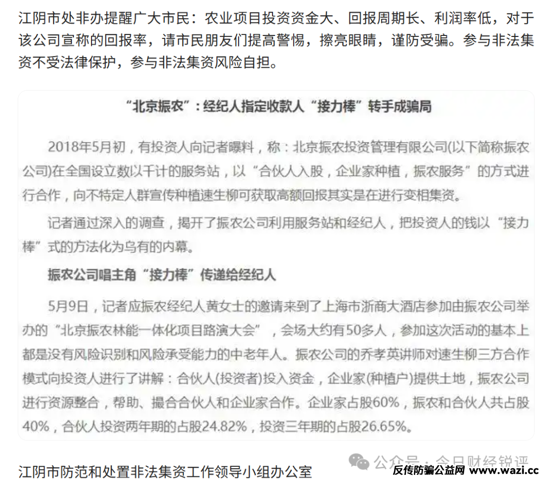 2020年11月,江阴市防范和处置非法集资工作领导小组办公室就发布风险提示,指出北京振农投资管理有限公司面向社会公众以“投资速生柳项目”为由开展投融资活动。