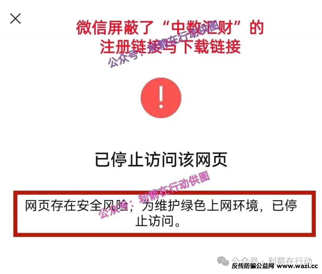 在微信中打开“中数汇财”APP的注册链接与下载链接,已经被屏蔽,屏蔽的理由:网页存在安全风险。这已经说明了“中数汇财”APP有风险。