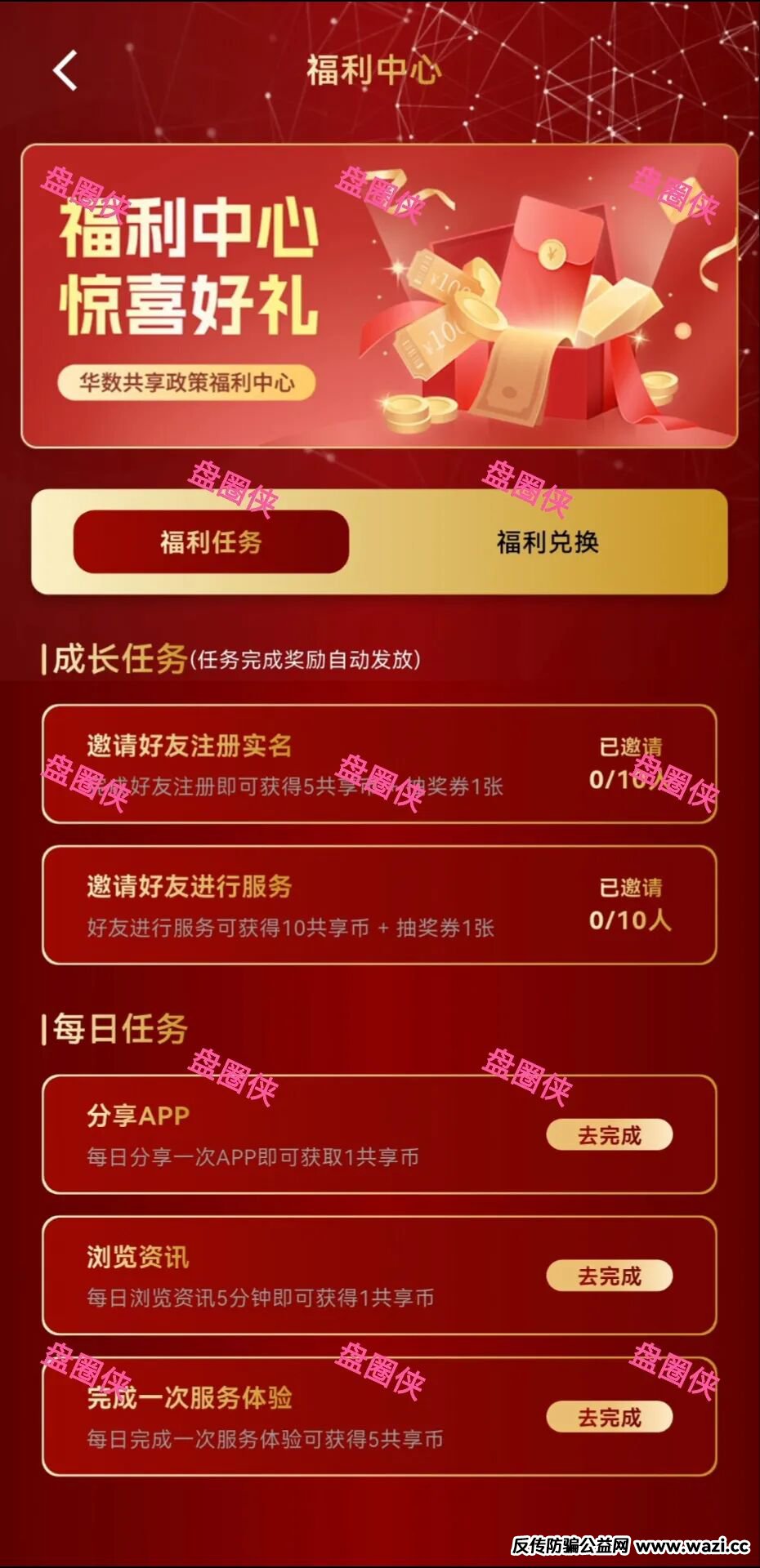 邀请好友注册实名、邀请好友进行服务、分享APP、浏览资讯和完成一次服务体验都可获得共享币,共享币可兑换成抽奖机会和股权分红收益加倍卡。