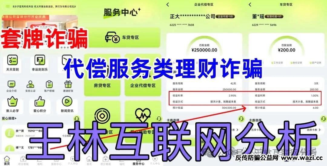 不法分子冒充香港某公司的名义,打着“代偿服务”的旗号,虚构推广“车贷代偿”“房贷代偿”“企业代偿”等按天计息,高额返利进行诈骗活动,高度预警,即将崩盘跑路。