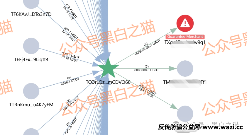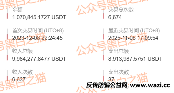 跑分的银行卡基本上都会转几圈分散再集中,虚拟币USDT也一样,通过记录跟踪,资金盘客服给的地址,资金量还不小。