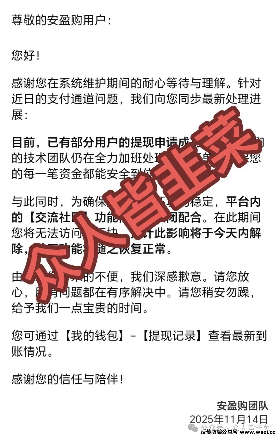 安盈购又一个商城模式诈骗资金盘,13号平台发布公告声称因支付通道出现短暂拥堵,导致了用户提现不到账,紧接着14号平台又发布公告,平台正在系统维护,并且已有部分用户提现成功,看似是...
