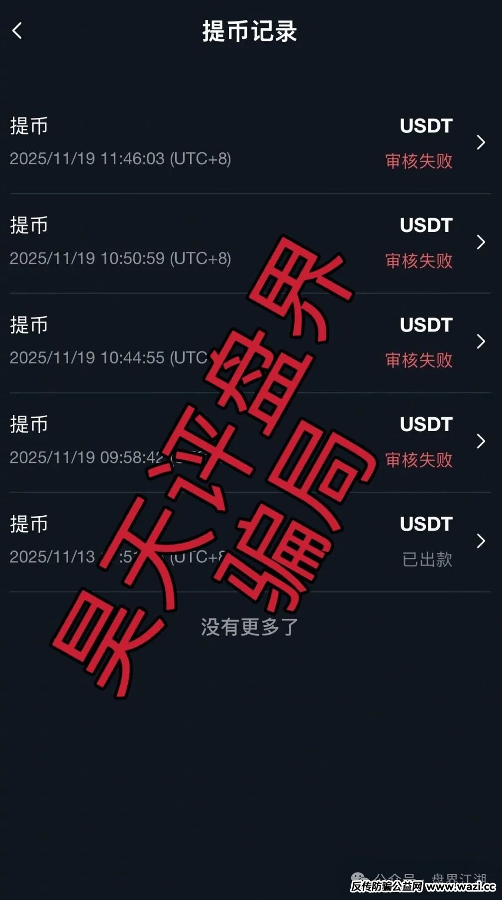 合约跟单类资金盘骗局昊天之前就说了都是一样的货色,都是打着跟着赚钱的幌子,给你按时分红,但实际上,你的钱早就在项目方的账户了,你入金的这些app都是假的!公司也都是套牌的人家资料,等到你想要盈利出金的时候,你就会发现,账户登录不上了被封了,等到更多人想要出金的时候,直接就和下面图片一样显示“审核失败”,最后操盘手直接关网跑路了。然后就是平移到其他盘继续割你,还是那句话,人家就没打算返还你的本金,想要赚钱?门都没有!继续平移继续割...