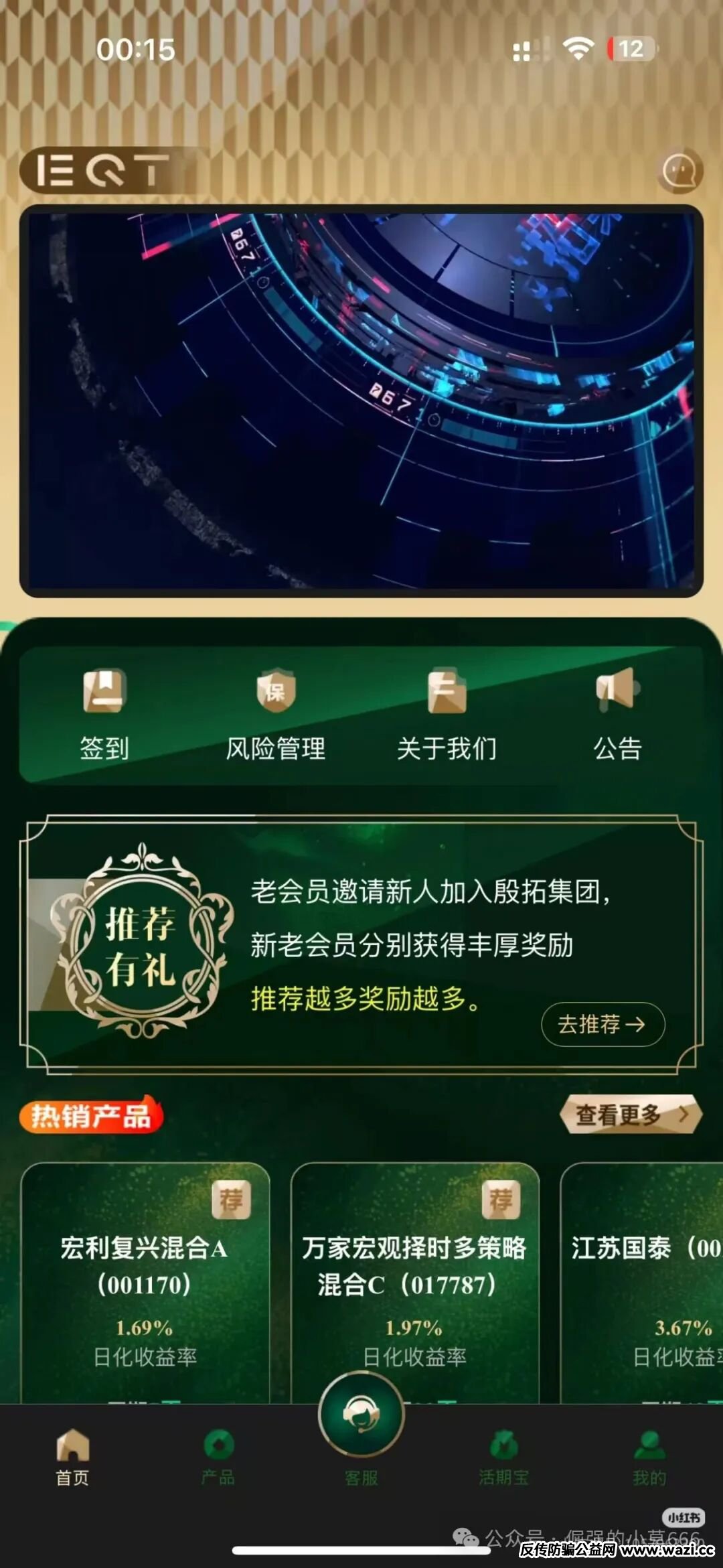 这年头,连诈骗都开始卷复利了。一个叫“EQT财富计划”的平台最近疯狂刷屏,打着“欧洲顶级私募殷拓集团(EQT)中国区项目”的旗号,宣称日化收益1.6%,算下来月收益直接飙到50%以上,年化轻...