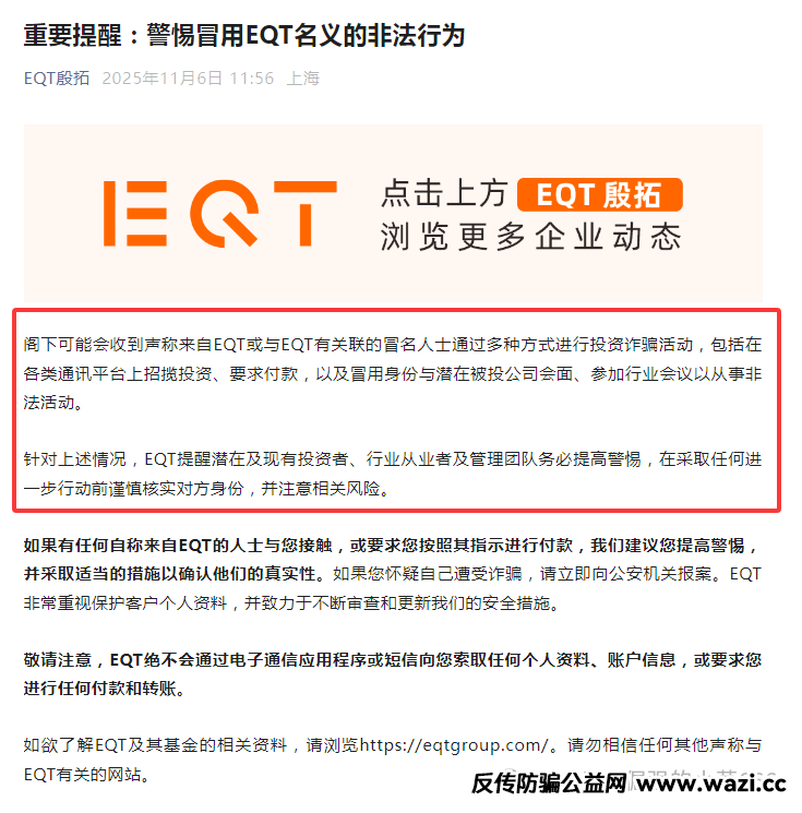 重要提醒:警惕冒用EQT名义的非法行为