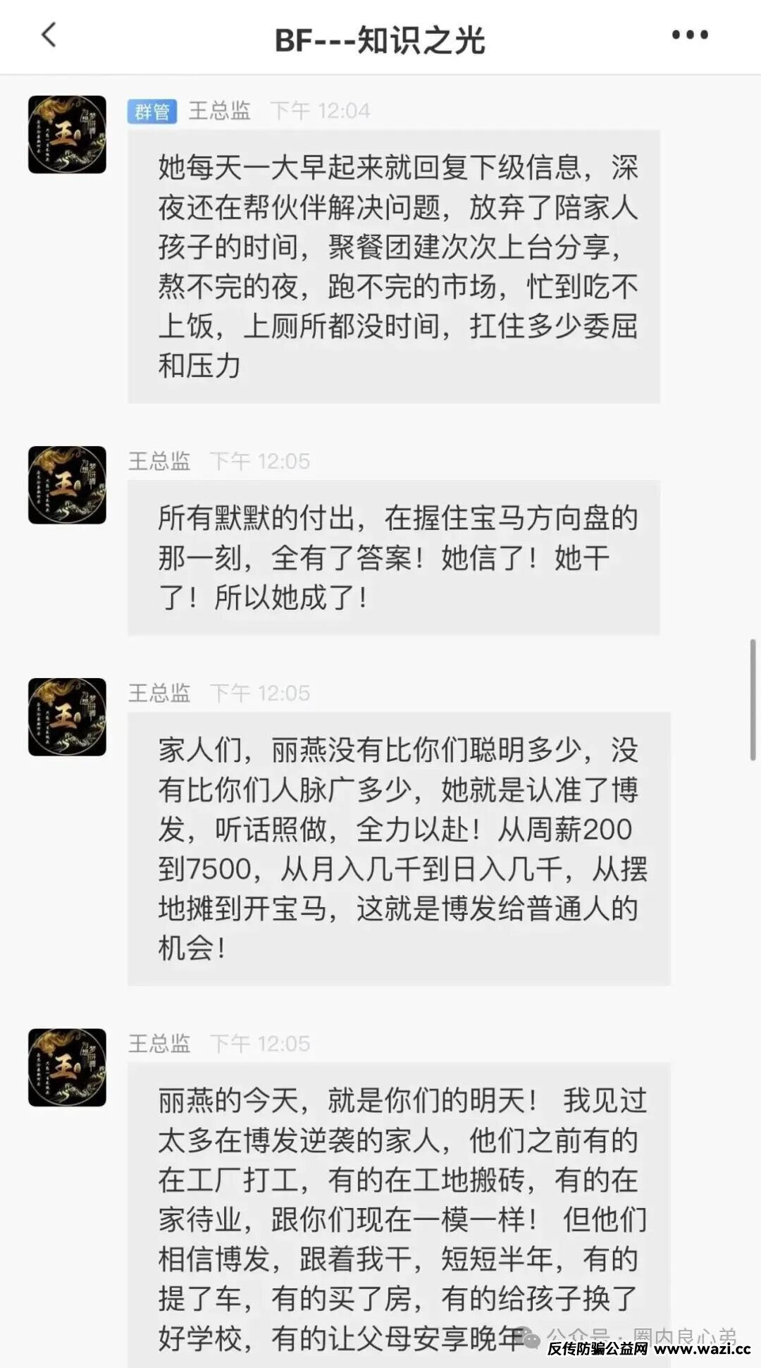 包括你们所谓的王总,现在还不在群里,定期给大家洗脑,充值信仰和某个企业合作,毕竟都是缅北诈骗窝点说的话术,都是这样的,出门在外身份都是自己给予的,你信了你也就输了,给狗庄三分钟演戏,能把你演的如痴如醉。