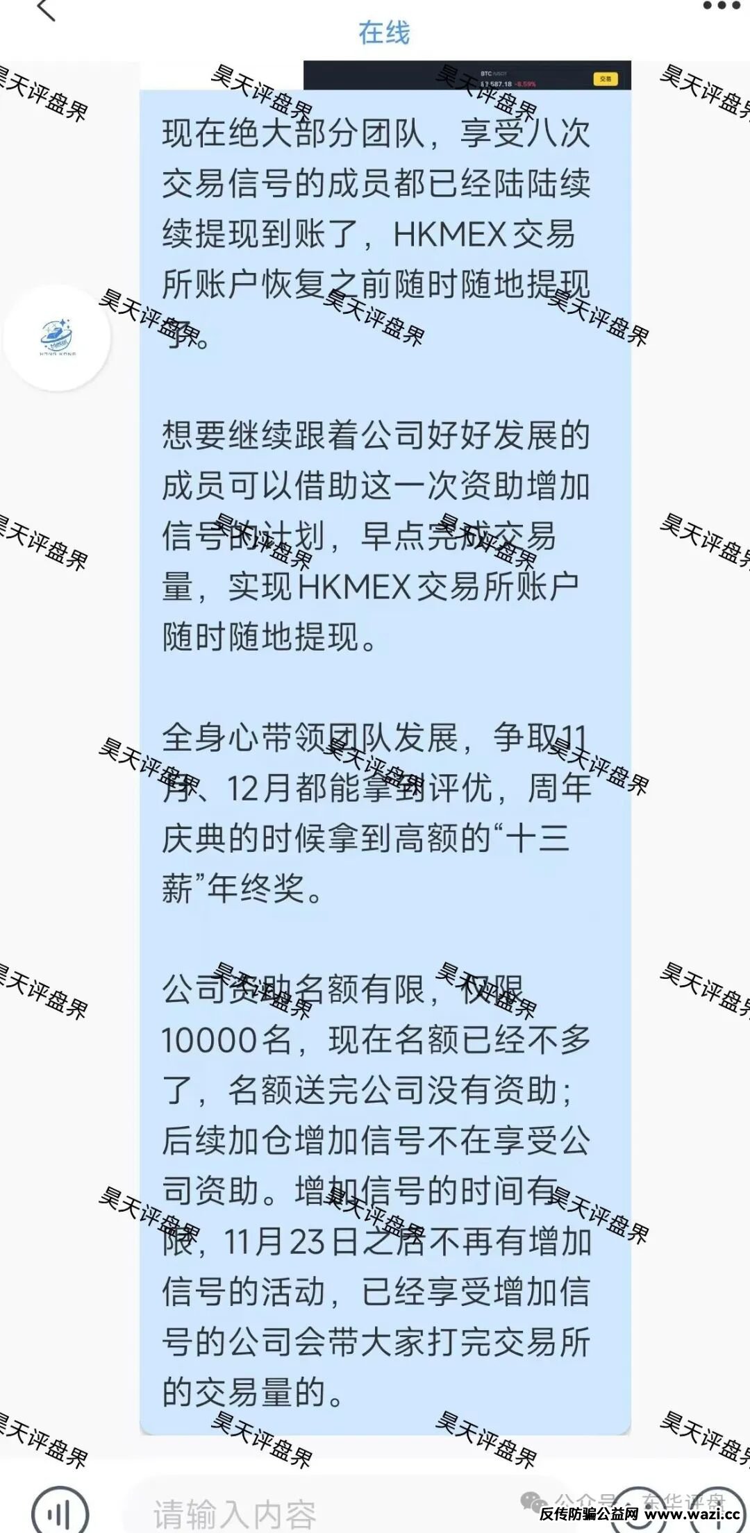 昊天评盘界:HKMEX交易所(澳门辉煌火炬联盟)资金盘骗局,昊天预警了几次了,11号的时候昊天就发文章说了,搞打码量才能提现就是二次收割,还有各种再次充值可以提现的活动,都是为了割最后一波,最新消息:此骗局今日凌晨彻底关网跑路了,跑路前还发布了跑路公告如下,目前受害者报警维权中,诈骗团伙保守估计圈钱几亿,你被割了吗?