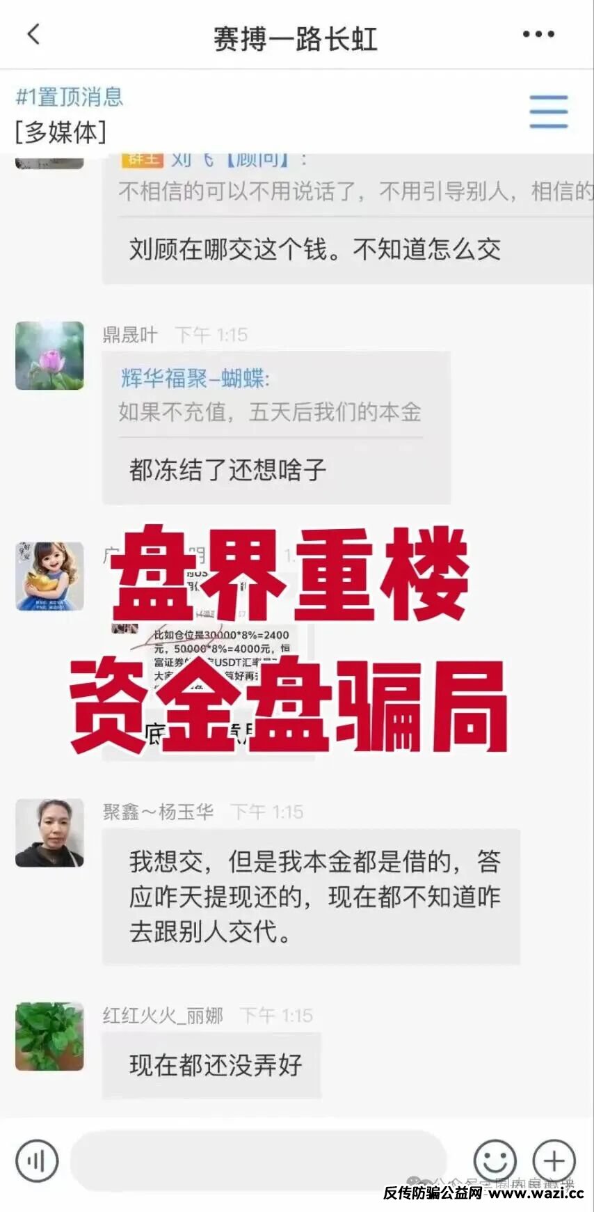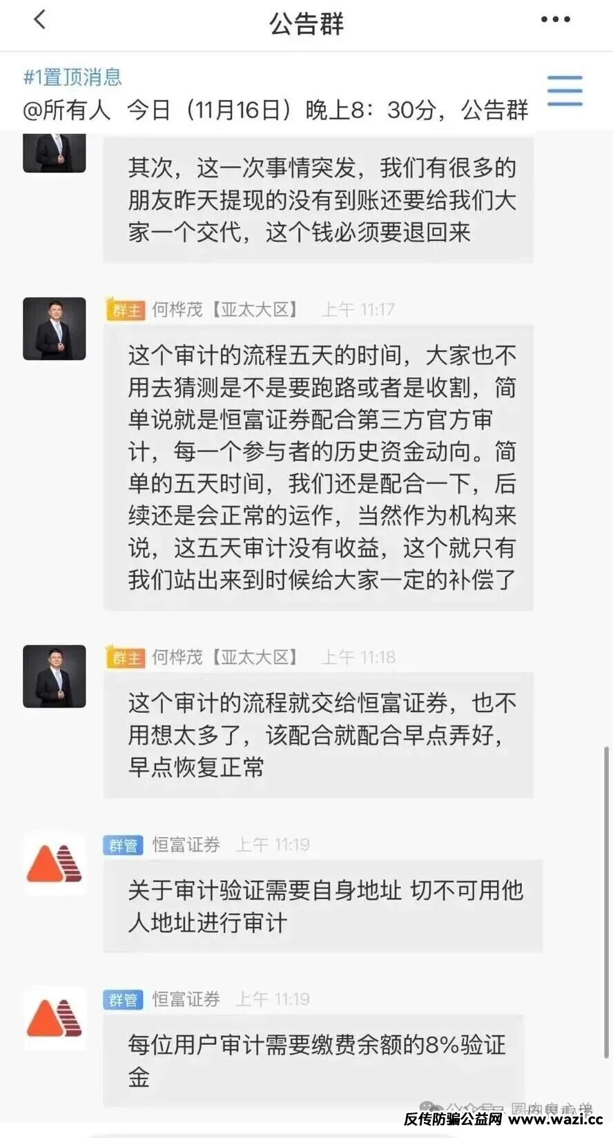 赛搏风投股票跟单类资金盘骗局,昨日上午发布公告已经崩盘,不能提现了,要求会员继续充值本金的8%“审计费”才能提现,群里还在忽悠,说什么他们其实代缴和本人缴纳都是可以审计,听听,...