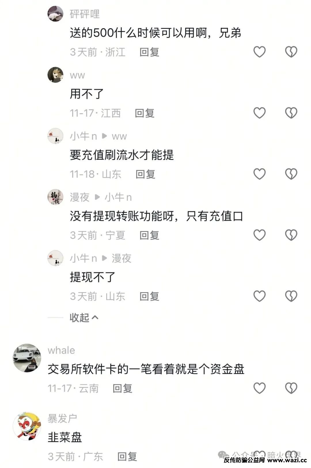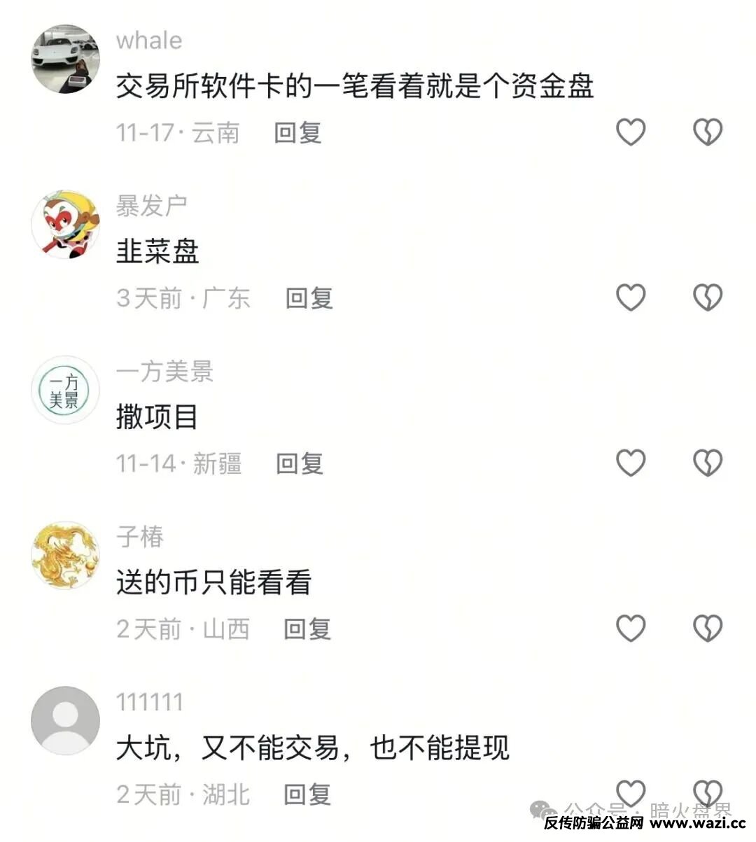 3:这样的野鸡交易所,基本都是套路,最终都是不了了之,不要看现在鼓吹的厉害,叫了很多行业KOL站台,最后都是一地鸡毛,你想要他所谓的空投,他想要你口袋的本金,这种交易所通过免费注册引流,最终都是会像之前俞凌雄搞的天体交易所,过渡到老虎AI基金资金盘,最终完成彻底收割。