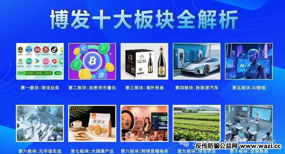 平台反复强调其布局“十大板块”,包括广告增值、加密货币量化分析、数字商城、新能源汽车、AI智能技术、元宇宙生态、大健康产业、跨境直播电商、绿色农业及智慧教育等,试图营造实力雄厚、科技前沿的形象。