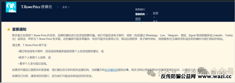 再看“普徕仕”本身——名字直接蹭美国老牌资管巨头T. Rowe Price(中文官方译名正是“普徕仕”)。这家公司成立于1937年,总部在巴尔的摩,全球知名,管理资产超万亿美元。但人家早在官网和多个渠道发布防骗声明:从未在中国大陆开发或运营任何面向普通民众的投资理财APP,也未授权任何第三方开展相关业务。