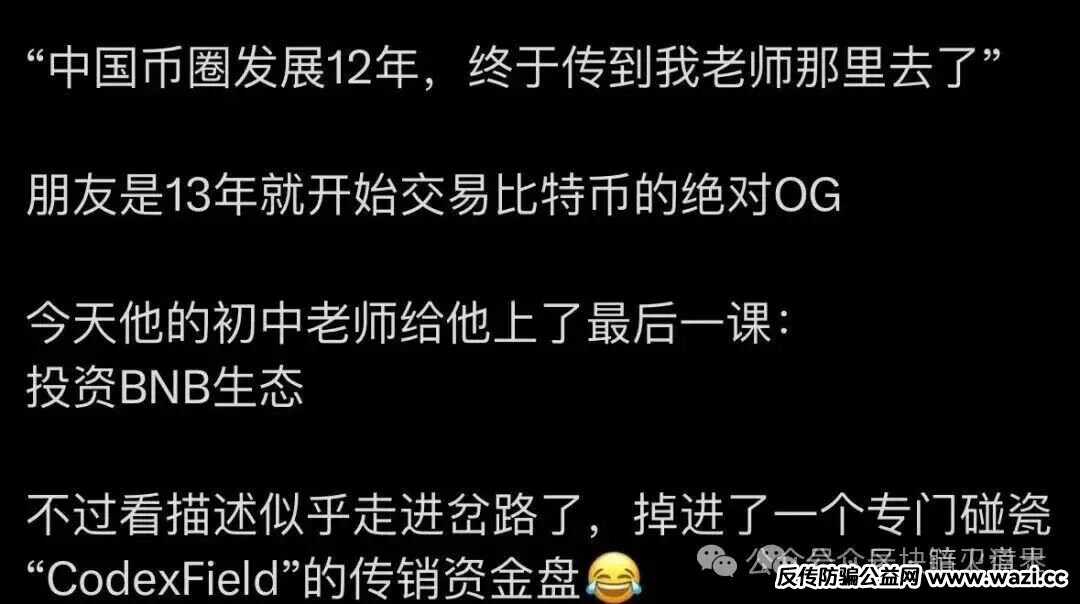 :赵长鹏作为加密货币行业的领军人物,早已实现财富自由,其商业决策向来以严谨审慎著称,怎么可能为一个风险极高的资金盘站台?这种宣传不仅是对行业头部从业者的恶意碰瓷,更是对公众认知的刻意误导,漏洞百出却妄图蒙骗不明真相的投资者。