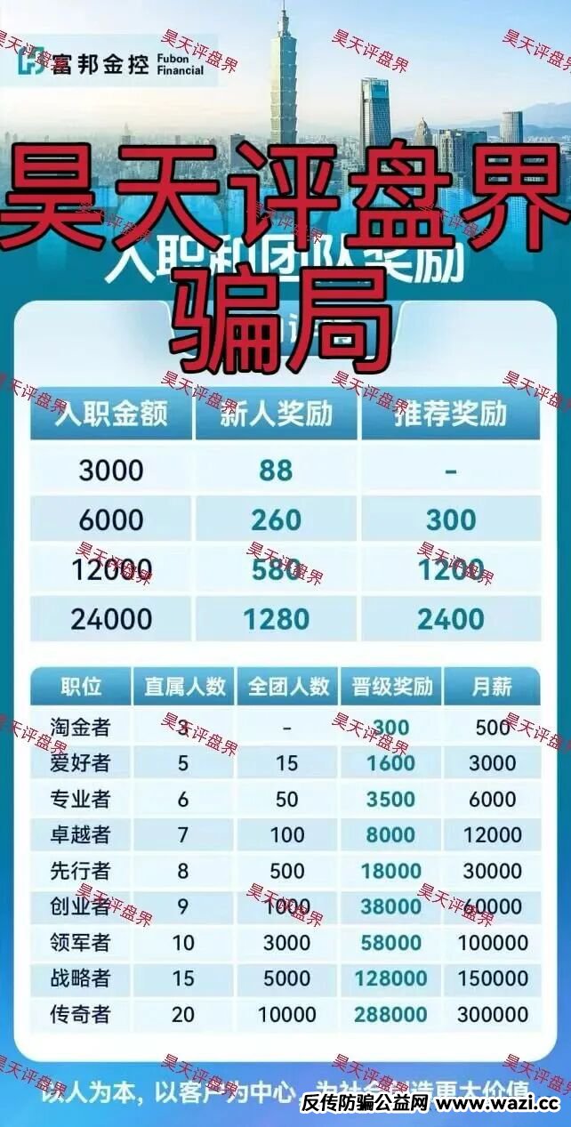 昊天评盘界:近期不少粉丝爆料了一个叫“富邦金控”的骗局,警惕套牌的“富邦金控”资金盘骗局,和人家正规公司没有任何关系,属于典型的境外杀猪盘!不法分子冒充正规公司,制作涉诈APP。打着“稳赚不赔”的旗号,日收益率2%。通过未备案链接等下载,采用传销模式发展下线从淘金者到传奇者一共9级层级,以第三方或虚拟货币收款,涉传销、诈骗、洗钱等。大家看见一定要远离!