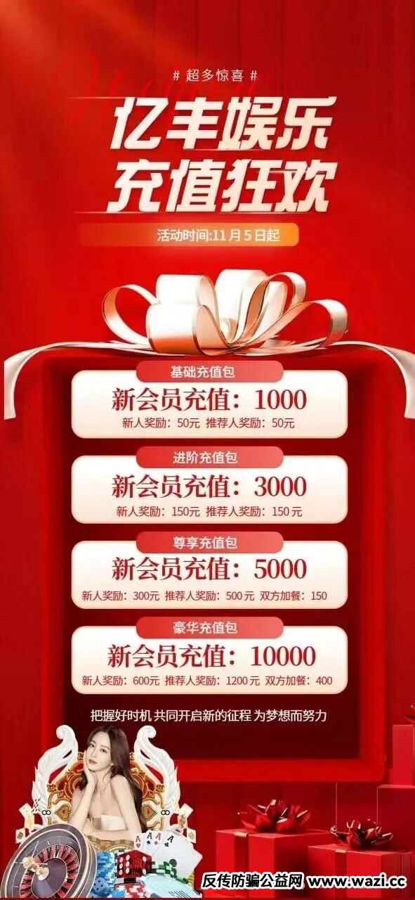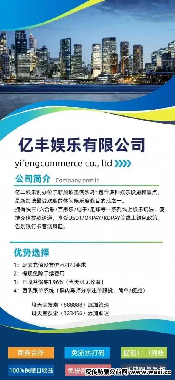 最近好多过来曝光项目的 轮回都没时间去曝光 最近有人来曝光一个叫做亿丰娱乐的项目 ,实则就是彩票跟单项目 ,这种项目就是打着彩票带单 实则后台随时能控制开奖结果 ,而且这种模式 还吸...