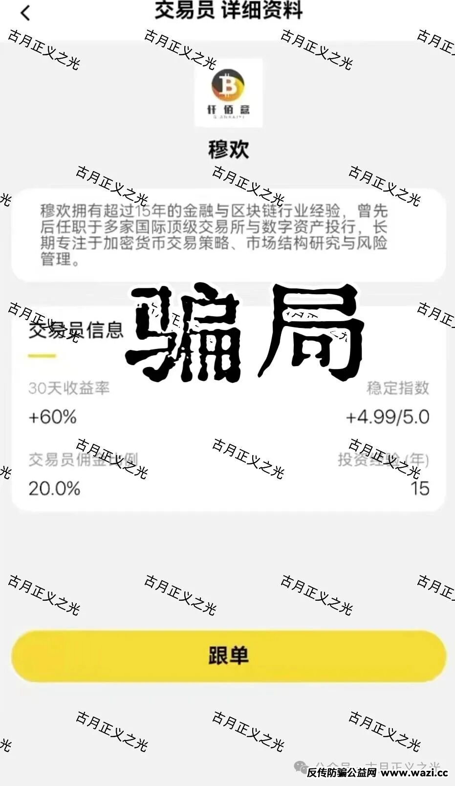 这个骗局包装的穆欢号称拥有超过15年的金融与区块链行业经验,曾先后任职于多家国际顶级交易所与数字资产投行,长期专注于加密货币交易策略、市场结构研究与风险管理。累计管理资产规模有10亿u,你就听这些诈骗犯吹吧,真有这些钱还能出来搞诈骗?
