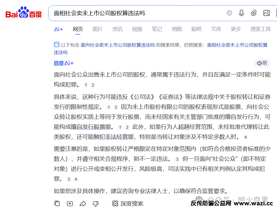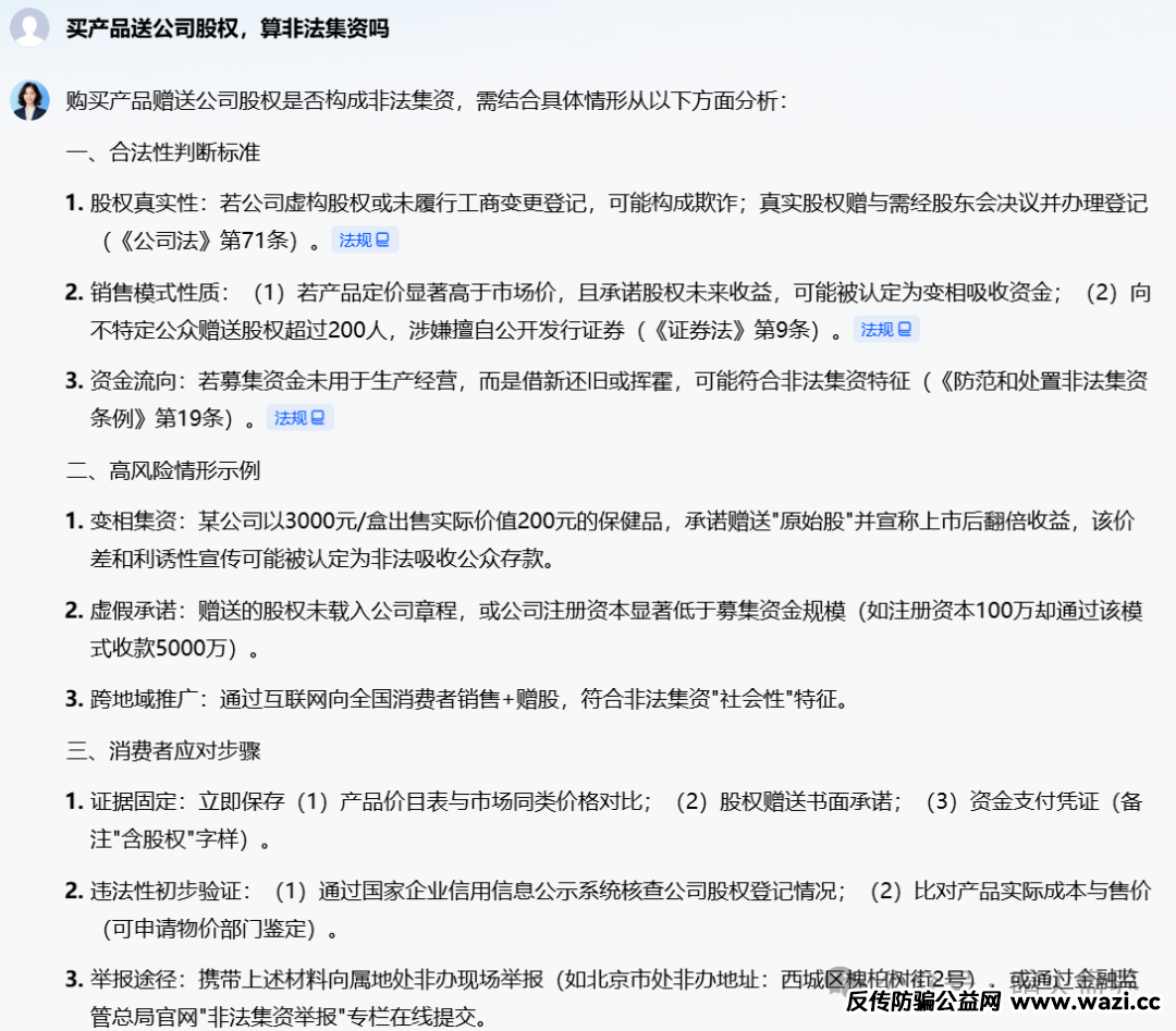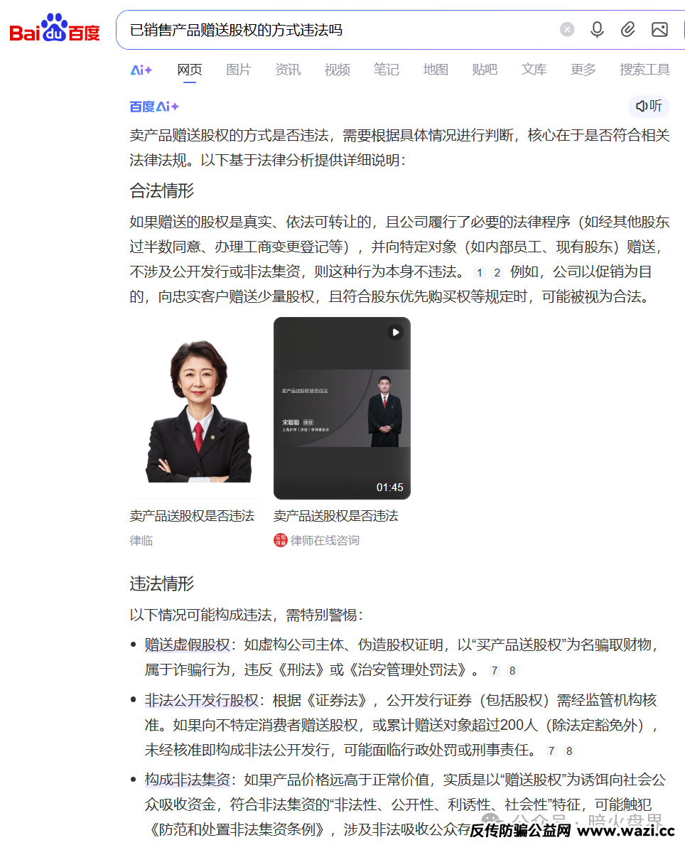 另外购买产品附赠股权这种说辞也不成立。如果赠送的股权是真实、依法可转让的,且公司履行了必要的法律程序(如经其他股东过半数同意、办理工商变更登记等),并向特定对象(如内部员工、现有股东)赠送,不涉及公开发行或非法集资,则这种行为本身不违法。‌例如,公司以促销为目的,向忠实客户赠送少量股权,且符合股东优先购买权等规定时,可能被视为合法。