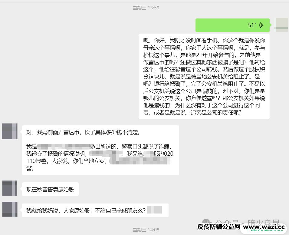 就在前些天一位粉丝向小诺透露关于“秒音”的新情况,其母亲在银行向秒音公司转账5万元意图购买该平台上销售的产品。银行工作人员问为什么向这家公司转账,其母亲说这家公司要上市了,现在买产品加入就送股权,上市后我把股权变现能赚很多钱。听到这样的说辞,银行的工作人员怀疑老人被网络资金盘洗脑,立刻向辖区派出所报案。派出所民警来到现场后详细了解了事情经过,老人向民警说明了秒音公司股权上市的情况。民警根据老人的说辞和秒音的宣传资料基本断定为涉诈、涉传公司。随后民警查询了老人最近几年的大额转账记录。看到其参与过众多网络资金盘项目。比如:雷达币永倍达等。大家都知道这些项目都已经崩盘了。民警看到老人有多次被骗的经历,马上联系了其家人,也就是小诺的这位粉丝。向其说明情况后,并告知要求家人止付老人的全部银行卡、微信和支付宝账户。以保证老人在醒悟之前不再被此类骗局洗脑,最大限度的保护老人的财产和资金不受损失。