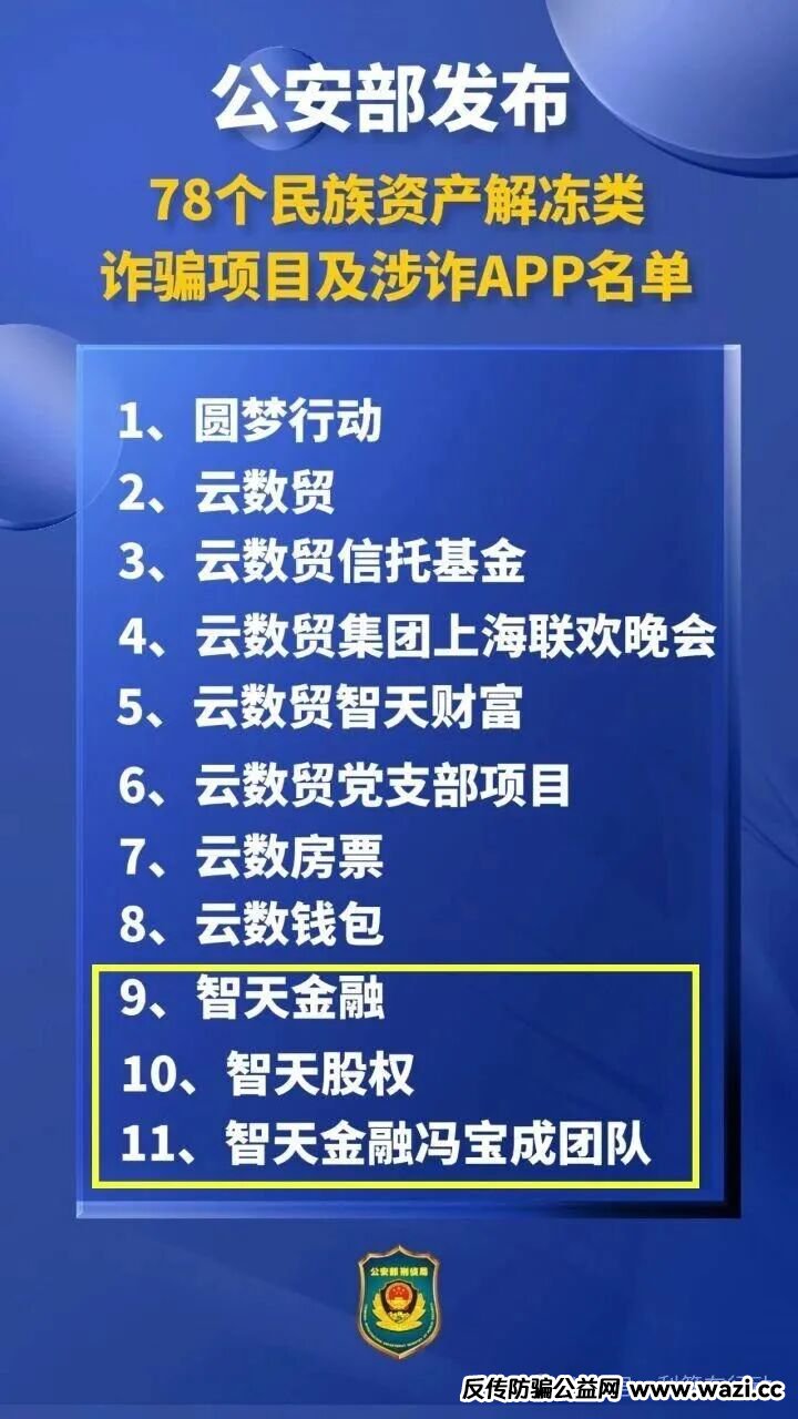 公安部公布了“智天金融”、“智天股权”是民族资产解冻类诈骗项目。