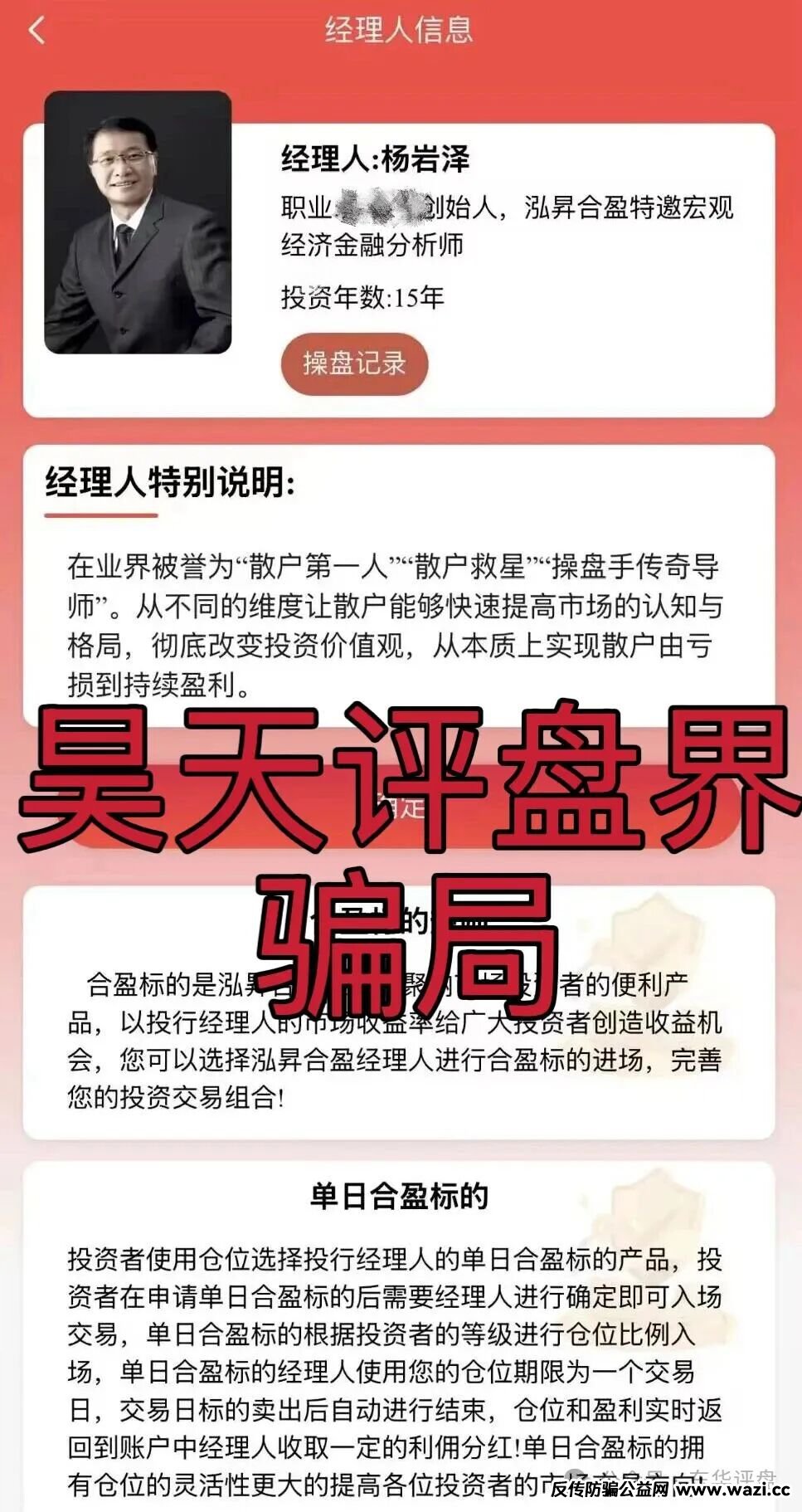 此骗局包装的骗子号称是经济金融分析师投资年数15年,在业界被誉为“散户第一人“散户敕星“操盘手传奇导师”。从不同的维度让散户能够快速提高市场的认知与格局,彻底改变投资价值观,从本质上实现散户由亏损到持续盈利。合盈标的是泓昇合盈推出的聚纳市场投资者的便利产品,以投行经理人的市场收益率给广大投资者创造收益机会,您可以选择泓昇合盈经理人进行合盈标的进场,完善您的投资交易组合!单日合盈标的投资者使用仓位选择投行经理人的单日合盈标的产品,投资者在申请单日合盈标的后需要经理人进行确定即可入场交易,单日合盈标的根据投资者的等级进行仓位比例入场,单日合盈标的经理人使用您的仓位期限为一个交易日,交易日标的卖出后自动进行结束,仓位和盈利实时返回到账户中经理人收取一定的利佣分红!其实股票跟单类资金盘骗局,日收益2%,月收益60%以上...