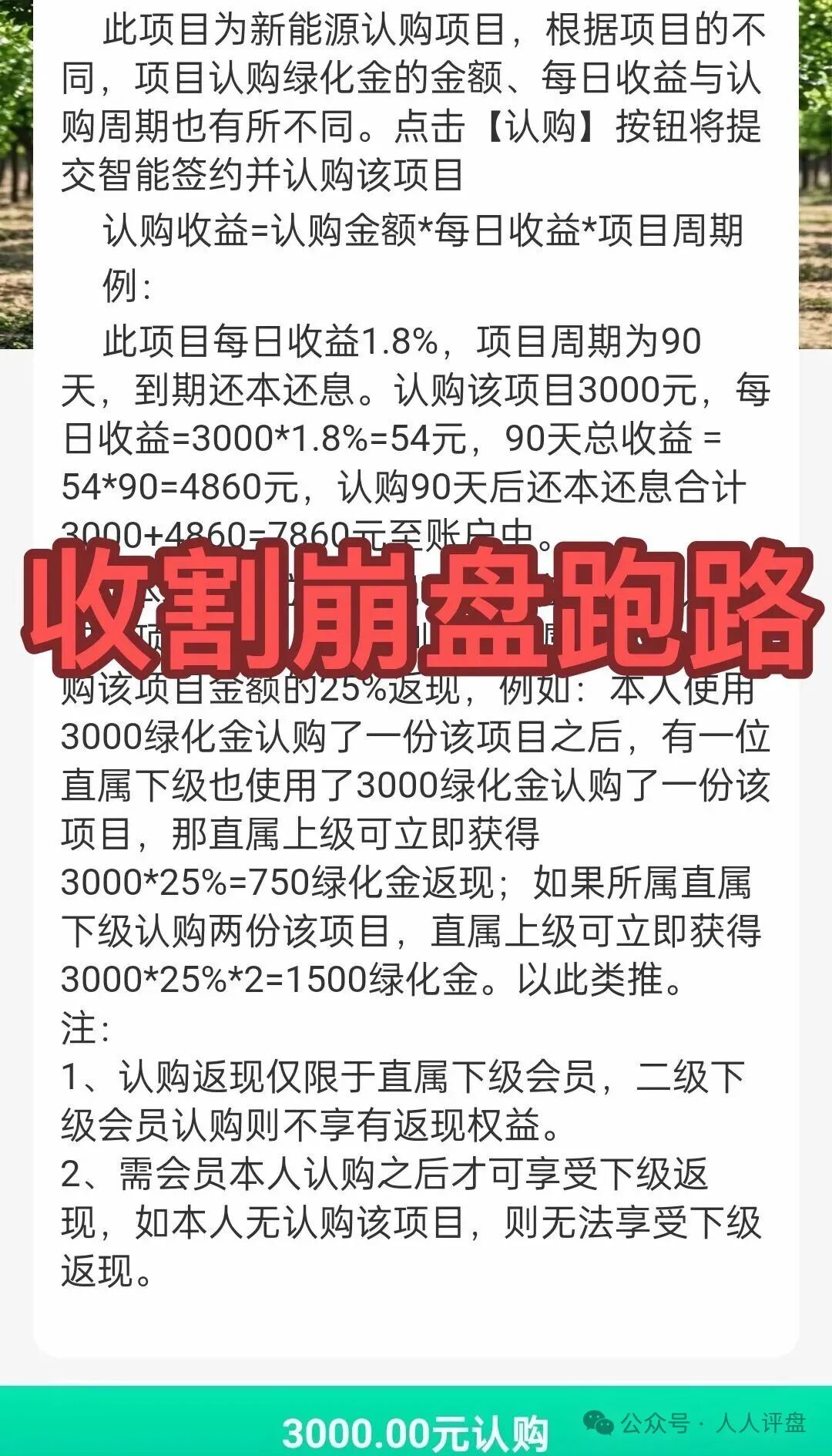 正隆林业资金盘,骗子已经收割跑路了,只要你爱吃骗子画的饼,那你就要付出相应的代价,资金盘不会无缘无故的出送钱活动,3k的投资产品,下级购买上级直接获得750返现,活脱脱的诱惑你去拉韭菜进来送钱,不管是套牌冒充的,还是有空壳公司包装的,都是骗子骗人的手段,拿捏韭菜的小把戏,多回头看看,那些不可能跑路的大盘,那个不是有实力有背景,现在呢?