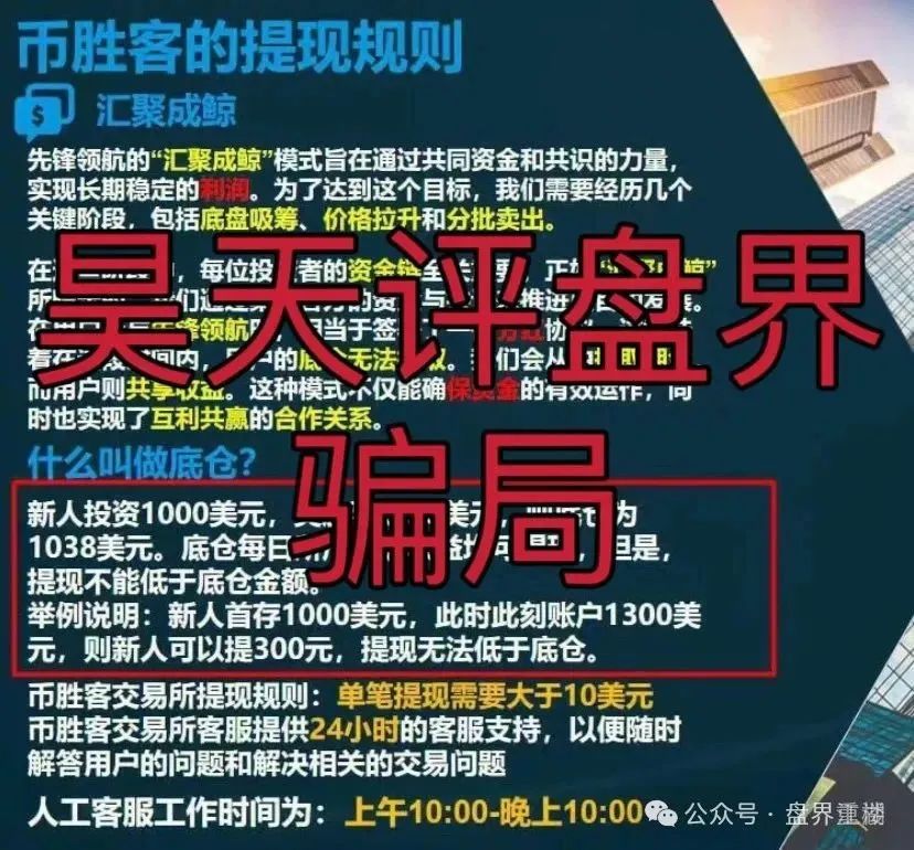 最近有个叫“币胜客”(先锋领航俱乐部)的交易所搞跟单资金盘,盘界研究了一下,发现这玩意儿就是个纯纯的割韭菜工具。他们让你下载个山寨交易所,号称带单稳赚,结果系统烂得跟十年前的微交易一样,现在操盘手已经卷走上亿,眼看就要崩盘跑路!